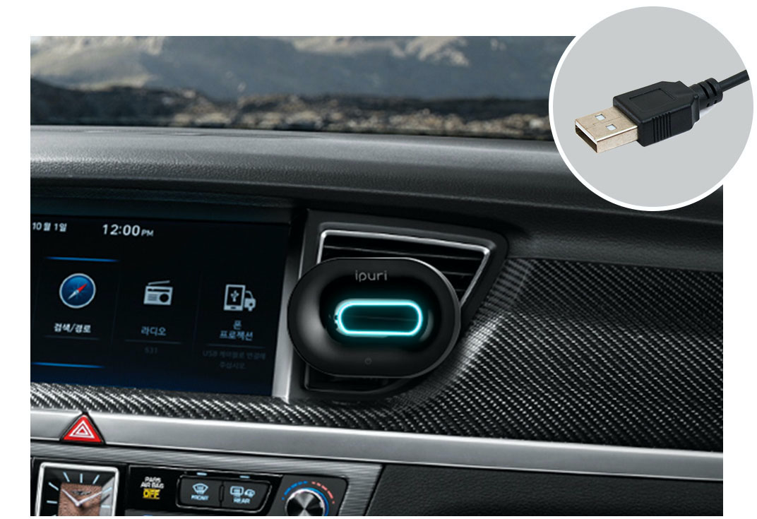 1. 本体の下段にあるC-Typeケーブルを連結し、USBケーブルを車両 に差し込むと本体の内側にある青いLEDランプが点灯し、動作しま す。(車両の機能によりエンジンをかけないと動作しません)